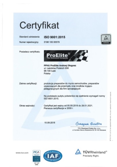 A ProElite orgulha-se de possuir a certificação ISO 9001:2015, concedida pela TÜV Rheinland Polska, que valida a excelência dos nossos processos de gestão e produção.